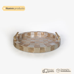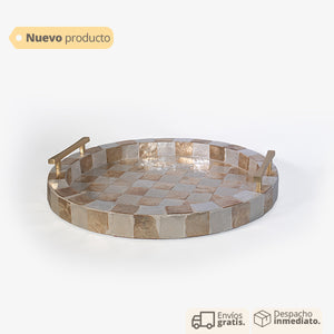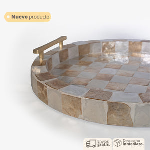 Esta exquisita bandeja redonda combina la elegancia natural de la concha nácar con un diseño moderno de cuadros en tonos blanco y beige. Con un acabado liso y bordes finamente trabajados, esta bandeja es ideal para usar como decoración en mesas de centro, para presentar aperitivos o incluso como base para velas y arreglos florales. Su diseño atemporal y versátil se adapta a estilos clásicos o contemporáneos, añadiendo un toque de lujo discreto a cualquier espacio.