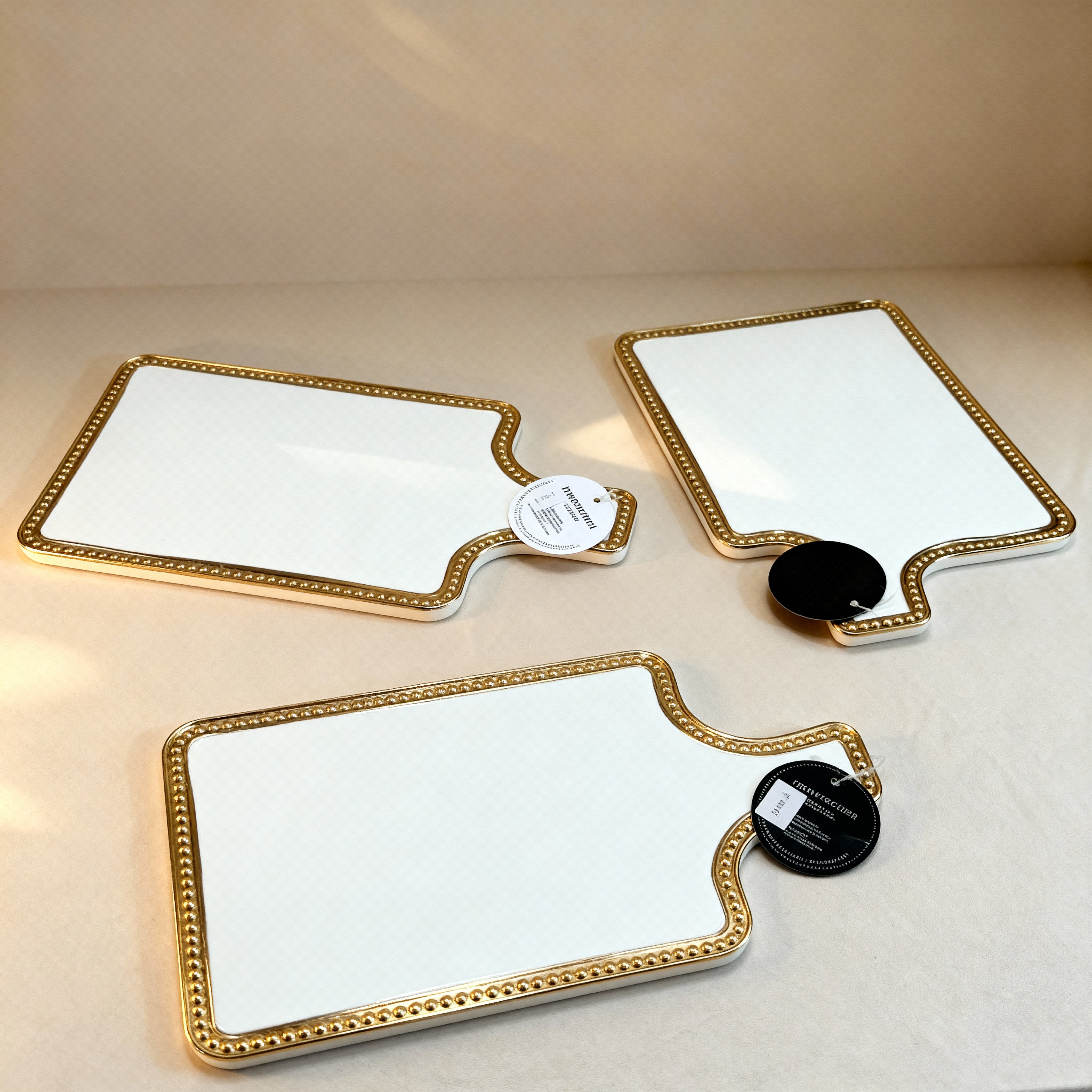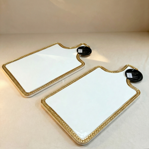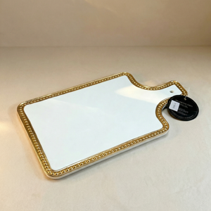 Bandeja decorativa rectangular con borde ondulado y acabado en blanco brillante, realzada con marco dorado de detalle perlado. Su diseño elegante y atemporal la convierte en una pieza ideal para servir, organizar o decorar mesas auxiliares, comedores o consolas. Aporta un acento sofisticado y luminoso a interiores clásicos o contemporáneos, perfecta para el hogar colombiano. Material tipo cerámica con acabado esmaltado