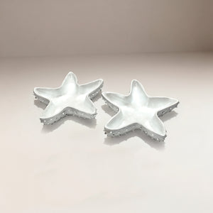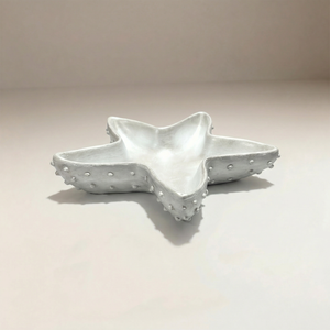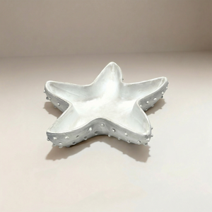 Bandeja decorativa en forma de estrella de mar, ideal para dar un acento costero y sofisticado a tus espacios. Su acabado blanco mate y textura artesanal aportan luz y frescura, perfecta para mesas auxiliares, consolas o centros de mesa. Funciona como pieza decorativa o para organizar pequeños objetos, combinando diseño orgánico y estilo contemporáneo en el hogar. Material tipo cerámica/resina con relieve sutil