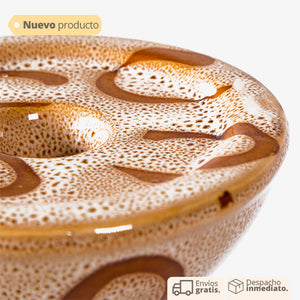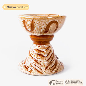 Candelabro con base color cafécon beige. Este candelabro podrás usarlo con velas gruesas o delgadas, también para colocarlos en repisa de decoración. Por si diseño es ideal para ambientes boho o clásicos