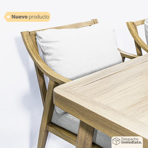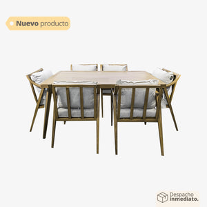 Incluye: *1 mesa *6 sillas *12 cojines No incluye: Accesorios decorativos o piezas no especificadas.