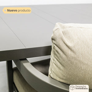Los cojines están confeccionados con tela antifluido en tono beige, lo que garantiza que sean resistentes al agua y fáciles de limpiar, perfectos para su uso en exteriores.
