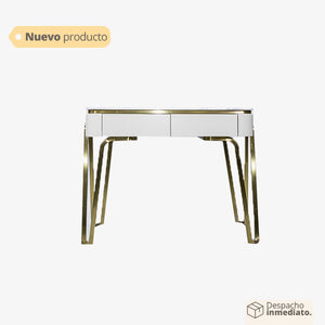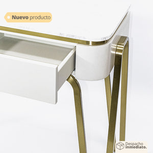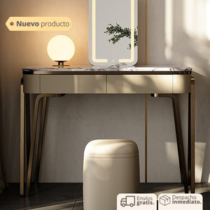 La consola presenta un elegante diseño con tonos dorados y beige que le confieren un aspecto lujoso y sofisticado.La cubierta de la consola está diseñada para imitar el aspecto del mármol, agregando un toque de elegancia y estilo a la pieza.
