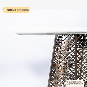 La base en color cobre resalta el estilo industrial con su acabado resistente y atractivo. Sus líneas lineales y estructura sólida crean un contraste fascinante con la delicadeza del mármol en la parte superior. El diseño lineal aporta un aire contemporáneo y ordenado, perfecto para espacios modernos y elegantes.