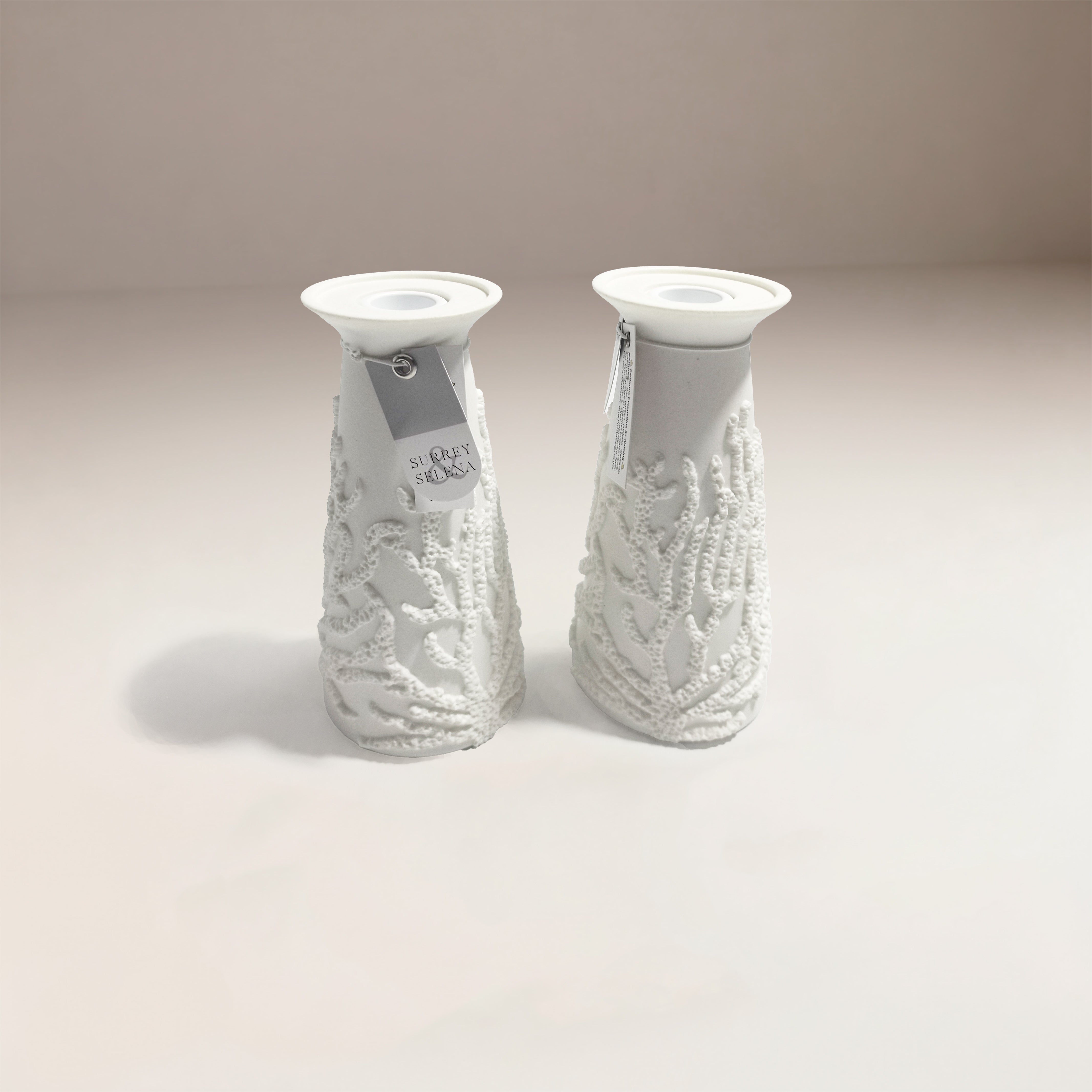 El candelabro Marbella es una pieza decorativa que combina elegancia y delicadeza en cada detalle. Fabricado en cerámica blanca, su diseño estilizado con relieve ornamental aporta textura y sofisticación, convirtiéndolo en el complemento ideal para realzar cualquier espacio del hogar.