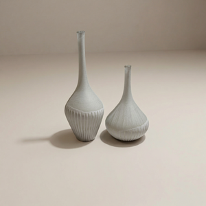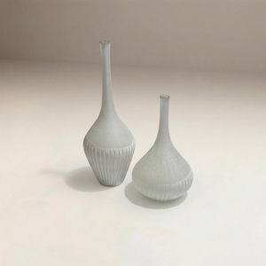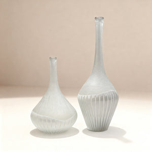 Fabricado con maestría en la India, este jarrón de vidrio presenta un acabado en color blanco con una textura sutil que añade profundidad visual sin recargar el ambiente. Es el complemento perfecto tanto para lucir solitario como con arreglos florales delicados.