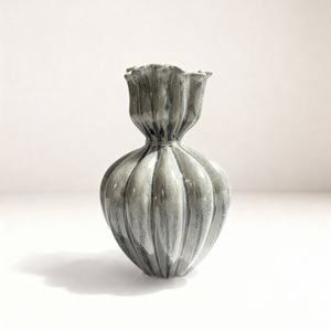 Diseño Escultural y Orgánico: El MARSELLA VASE presenta un cuerpo redondeado y generoso que se estrecha en un cuello acanalado, culminando en una elegante boca con borde ondulado o "volante", lo que le otorga un aspecto delicado y artístico.