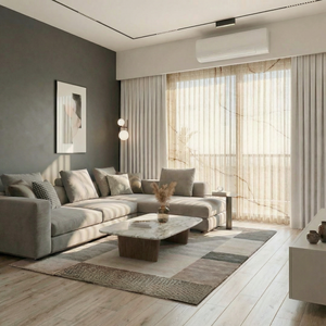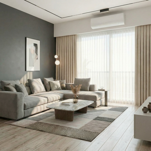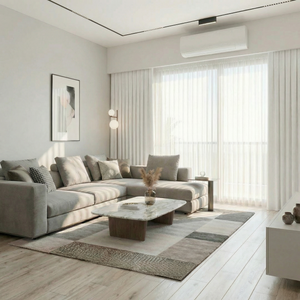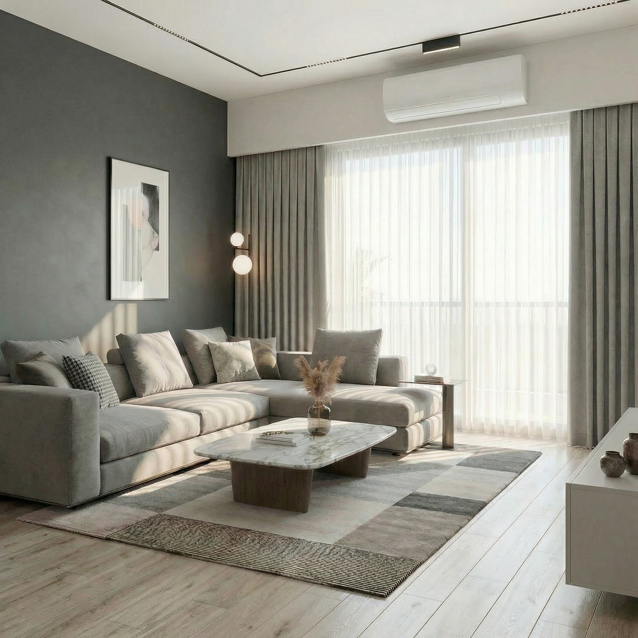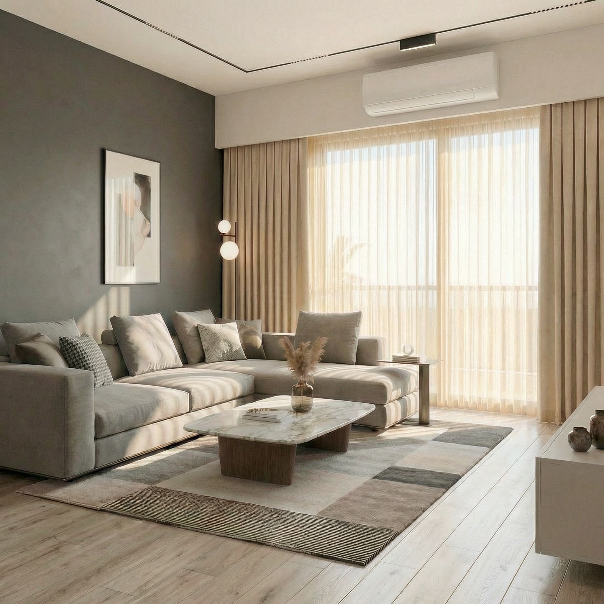 Acústica y Confort: Gracias al espesor de la tela pesada, este conjunto ayuda a absorber el eco del ambiente, mejorando la acústica de la sala. Nota de diseño: El uso de colores neutros en ambas capas permite que la cortina se integre orgánicamente con elementos de madera clara y mármol, como se observa en la ambientación de la imagen.