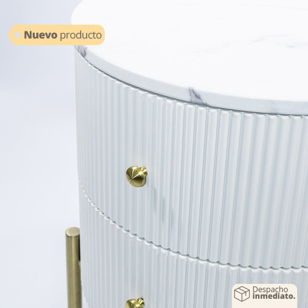 Los detalles dorados, como los tiradores de los cajones o pequeñas incrustaciones decorativas, agregan un toque de lujo y elegancia a la mesa de noche. El contraste entre el blanco y el dorado crea un aspecto sofisticado y glamuroso.