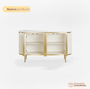 Marco y Base Dorada: El mueble está enmarcado por bandas verticales de metal brillante en acabado dorado o latón pulido, que se extienden hasta las estilizadas patas, creando un look cohesionado y de máximo glamour.