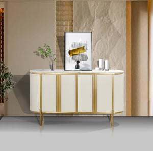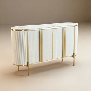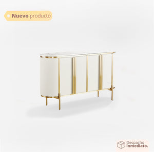 Tapa de Mármol Premium: La superficie superior está coronada por una impresionante tapa de mármol blanco (o efecto mármol de alta calidad), ideal para exhibir arte, jarrones o vajilla fina.