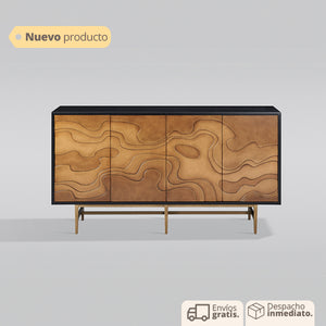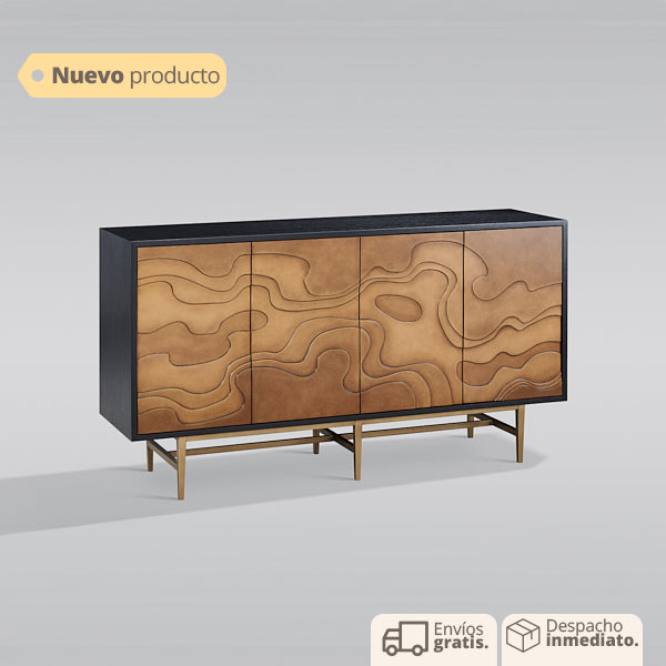 El contraste entre el negro profundo y el café cálido es enfatizado por los diseños de ondas, creando un equilibrio armonioso que llama la atención de manera sofisticada. Este contraste aporta profundidad y estilo al mueble, haciéndolo destacar en cualquier espacio.