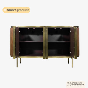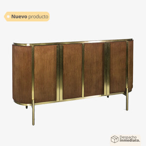 Las puertas del bifé lucen elegantes detalles dorados que añaden un toque de sofisticación y refinamiento al diseño. Las patas también presentan este acabado dorado, creando una unidad visual que resalta su belleza. El tono madera oak café aporta calidez y un ambiente acogedor a tu comedor.