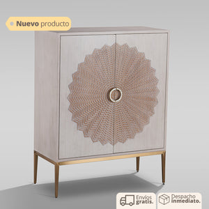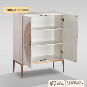 Este bife blanco con patas doradas y diseño floral en las puertas es una pieza que combina funcionalidad y estilo de manera excepcional. Su elegante diseño y acabados de calidad lo convierten en un elemento central y distintivo en tu hogar, añadiendo un toque de sofisticación y encanto a la decoración de cualquier espacio donde se coloque.