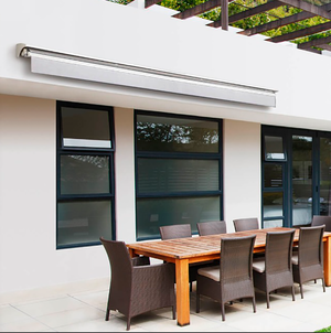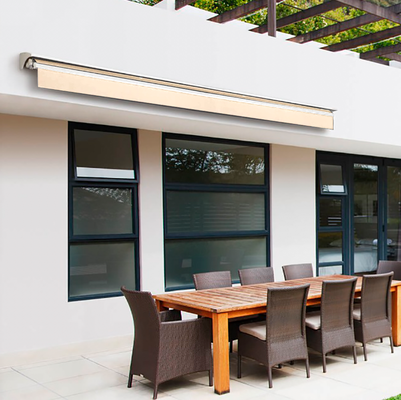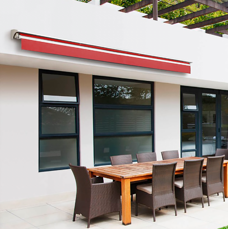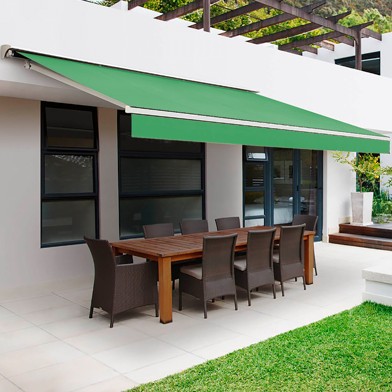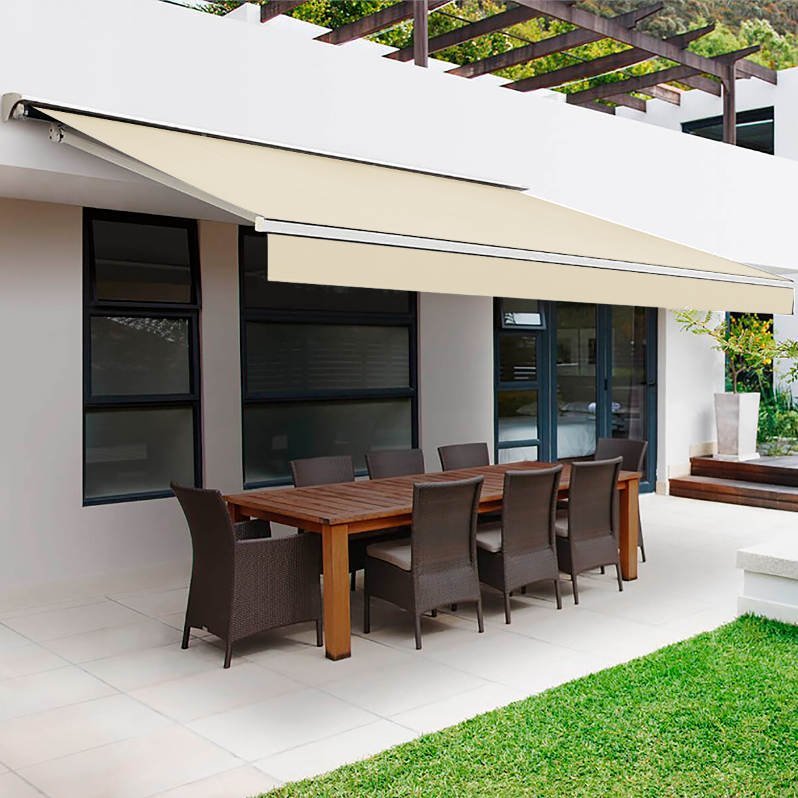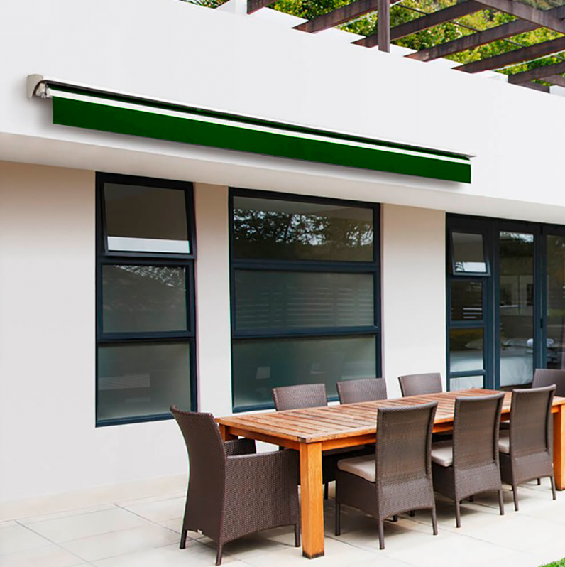 Nuestros toldos están compuestos por una estructura metálica, acompañada de una tela cuyo principal compuesto es el poliéster . Cuentan con un sistema articulado que permite extenderlo y detenerlo en distintos puntos durante el recorrido. Posee un sistema manual o motorizado