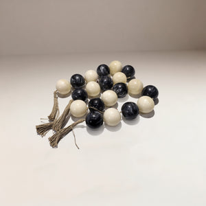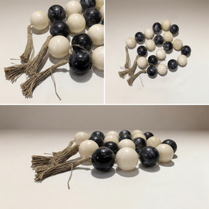 Set decorativo de esferas en tonos blanco marfil y negro, unidas con cordón textil y terminadas con borlas naturales que aportan textura y calidez. Su diseño atemporal y contraste de colores lo convierten en un accesorio versátil, ideal para complementar centros de mesa, bandejas decorativas, consolas o estanterías.