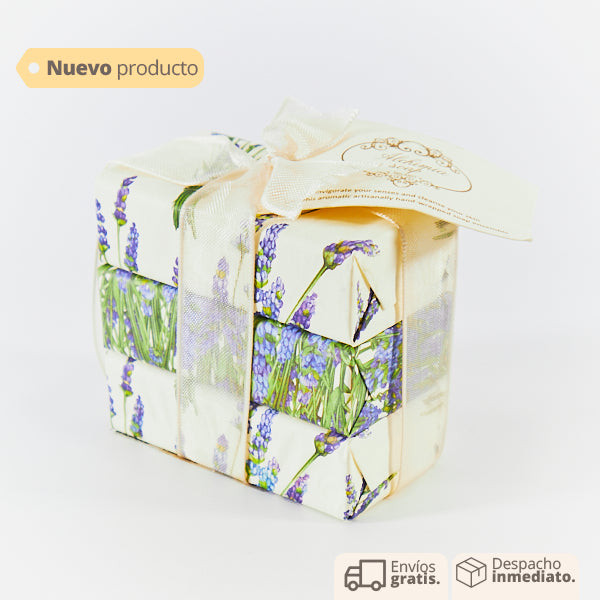 Un set de tres unidades de jabones con aroma a lavanda es una opción encantadora para el baño o para el cuidado de manos, ofreciendo una experiencia relajante y aromática que calma los sentidos y promueve la tranquilidad. Cada jabón está impregnado con el suave y reconfortante aroma de la lavanda, conocido por sus propiedades relajantes y calmantes.