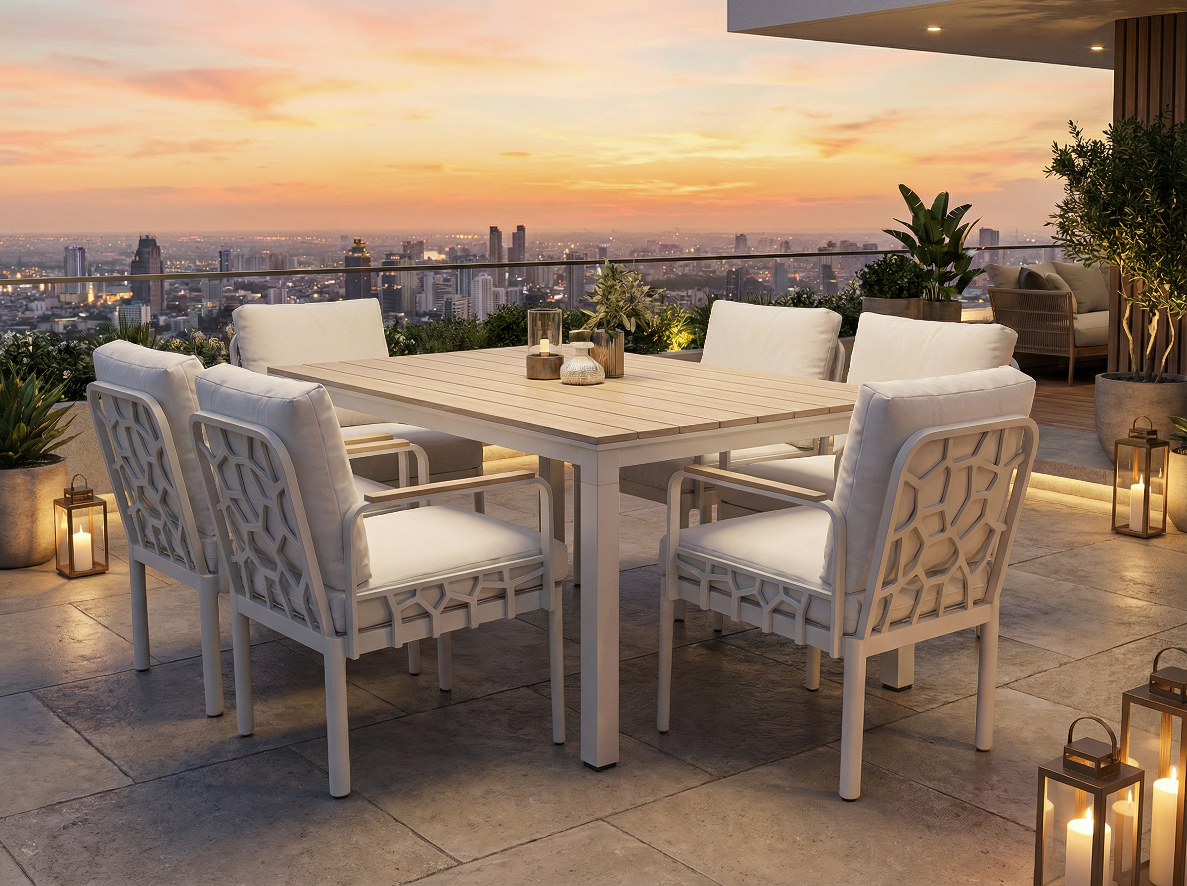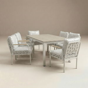 Disfruta de la elegancia y el confort en tus espacios al aire libre con el Juego de Comedor Barcelona. Este conjunto de 7 piezas está diseñado específicamente para exteriores, combinando durabilidad con un estilo contemporáneo en tono beige.