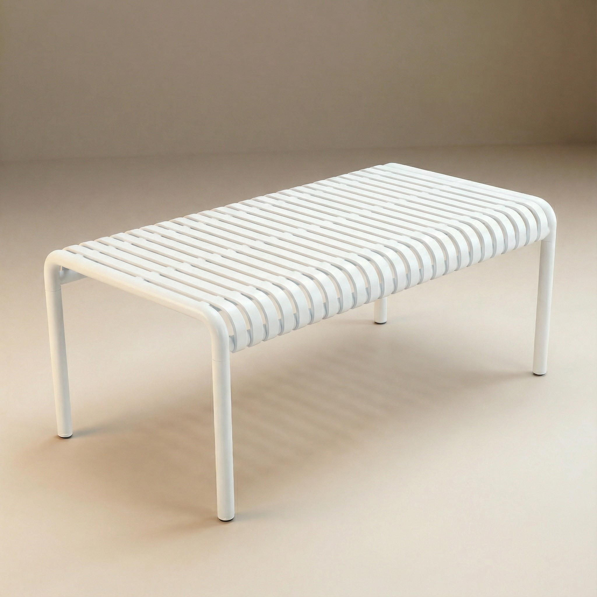 Estética Minimalista: Su acabado en color blanco y sus líneas rectas y sencillas, con patas tubulares robustas, ofrecen una apariencia ligera y luminosa que se adapta fácilmente a diversos estilos de decoración exterior, desde el mediterráneo hasta el minimalista.