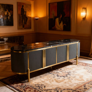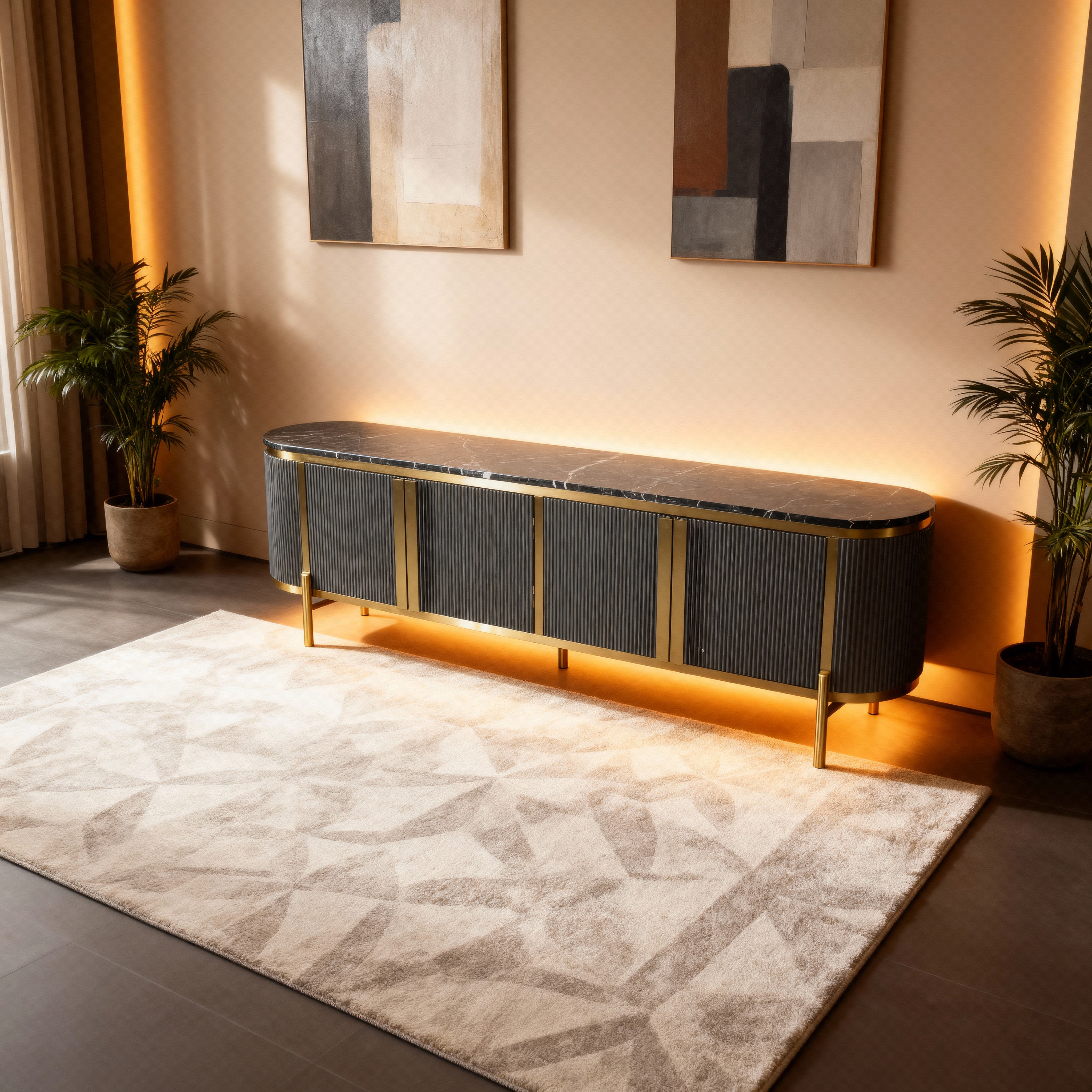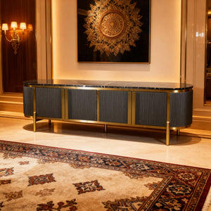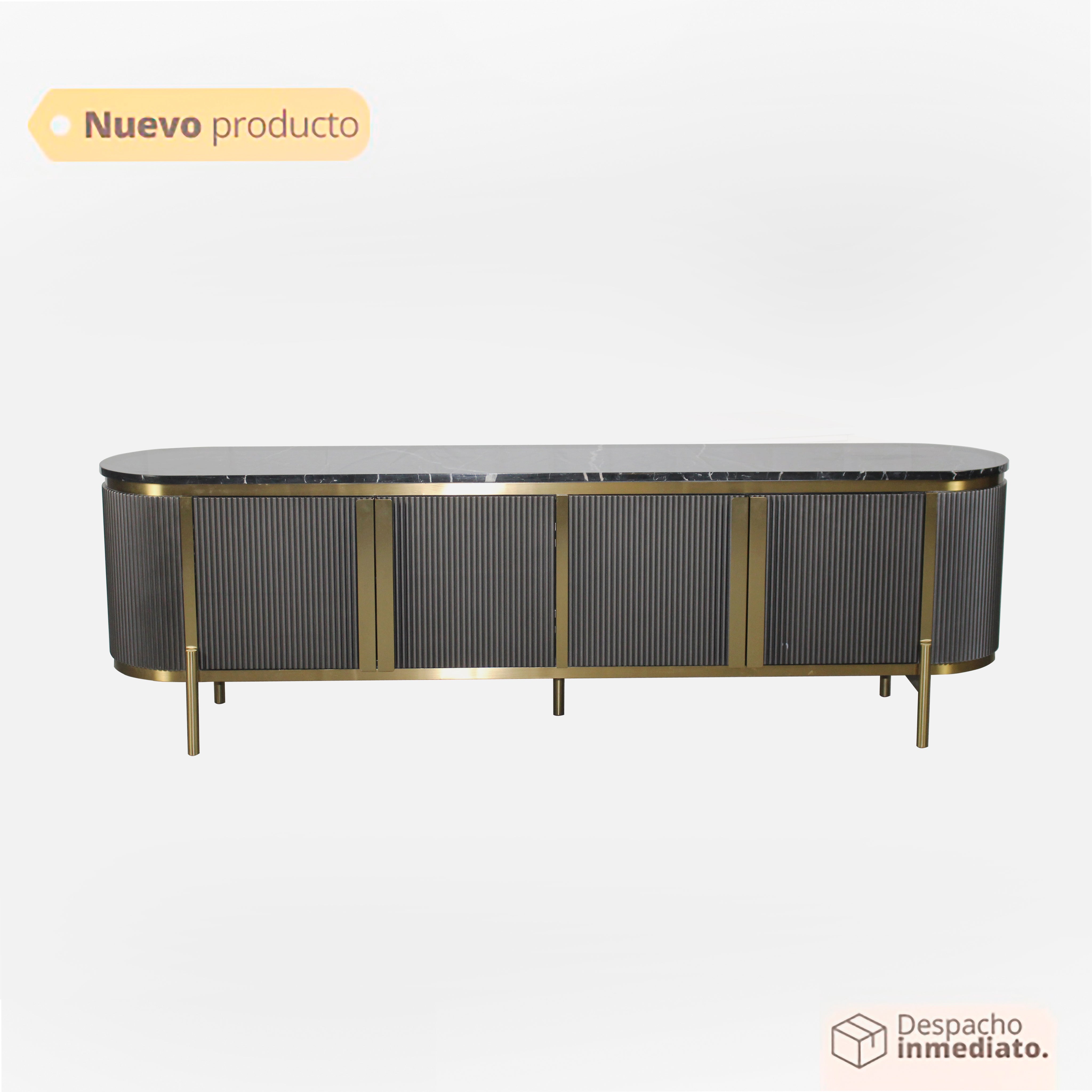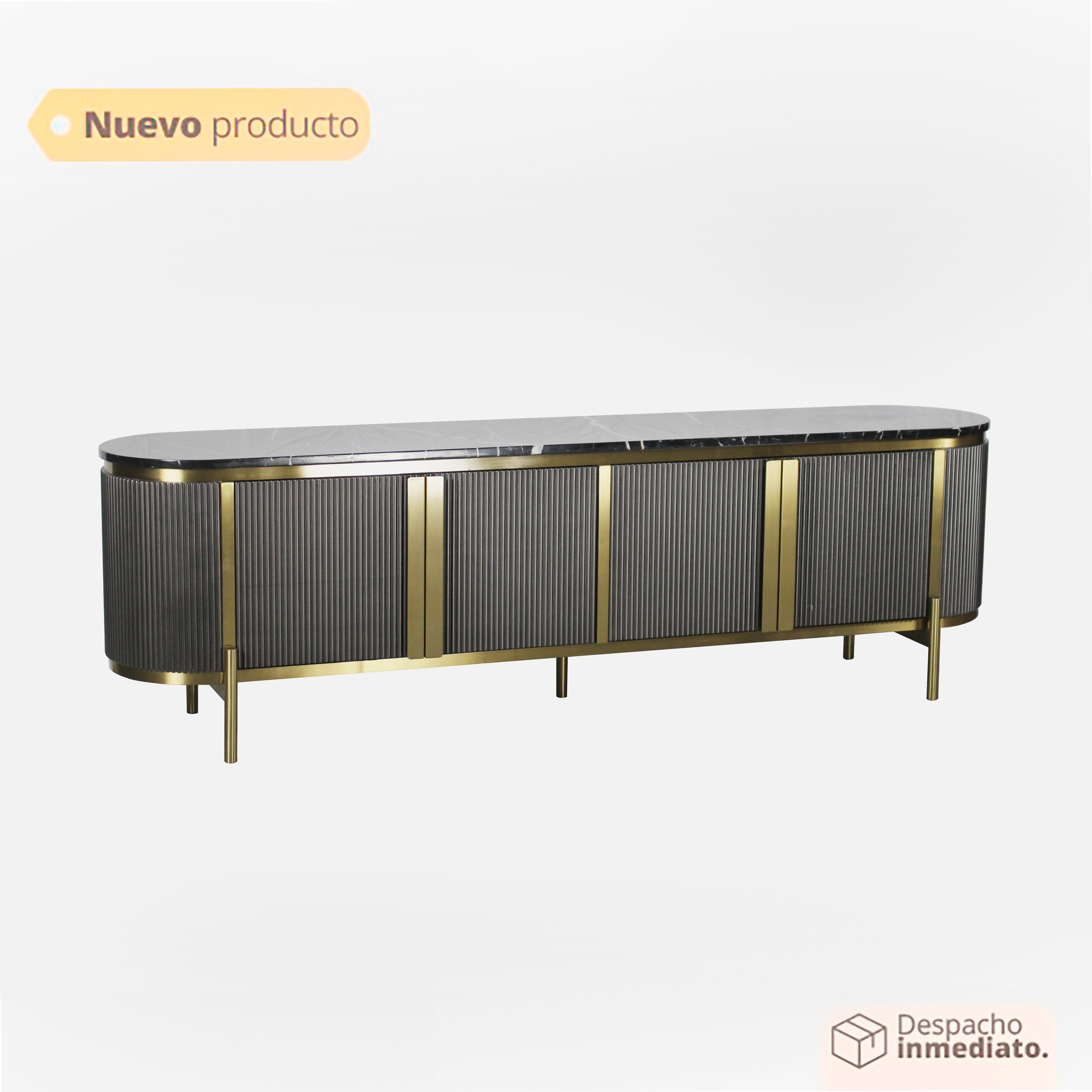Superficie Versátil: La extensa tapa de mármol es ideal para colocar un televisor de gran formato, exhibir piezas de arte, jarrones o como una estación de servicio en el comedor.