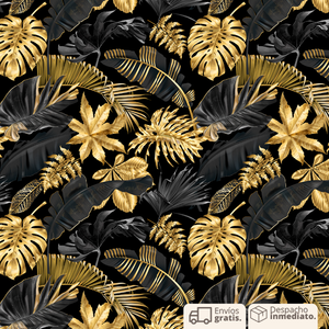 Un papel personalizado con un diseño de fondo negro y hojas negras y doradas es una elección sofisticada y elegante que añadirá un toque de lujo y misterio a cualquier espacio.