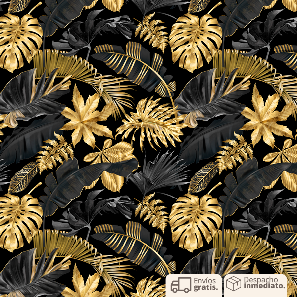 El papel presenta un patrón de hojas estilizadas en un fondo negro profundo y oscuro. Las hojas son predominantemente de color negro y dorado. El diseño es moderno y minimalista, lo que crea una sensación de elegancia y sofisticación.