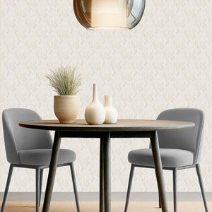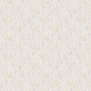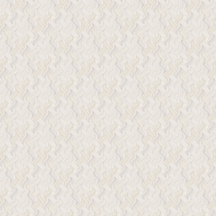 El papel de colgadura tiene un diseño texturizado de color beige claro, con un patrón repetitivo y entrelazado que recuerda a una tela de tweed o a un tejido en espiga. La textura es densa y compleja, creando un aspecto sofisticado y elegante que añade profundidad a la pared sin necesidad de un diseño de colores fuertes