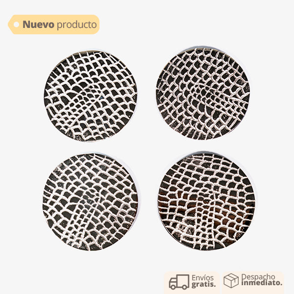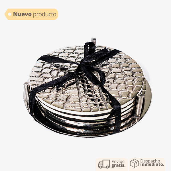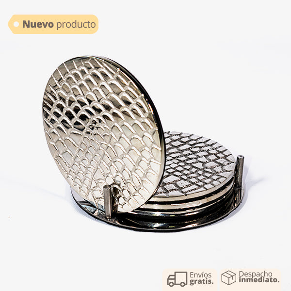 Portavaso setx4 en metal plateado, incluye base de soporte para 4 piezas. Portavaso elegante. Portavaso para pocillos, vasos, copas, tazas. Portavaso para evitar manchas en las mesas auxiliares y de centro.