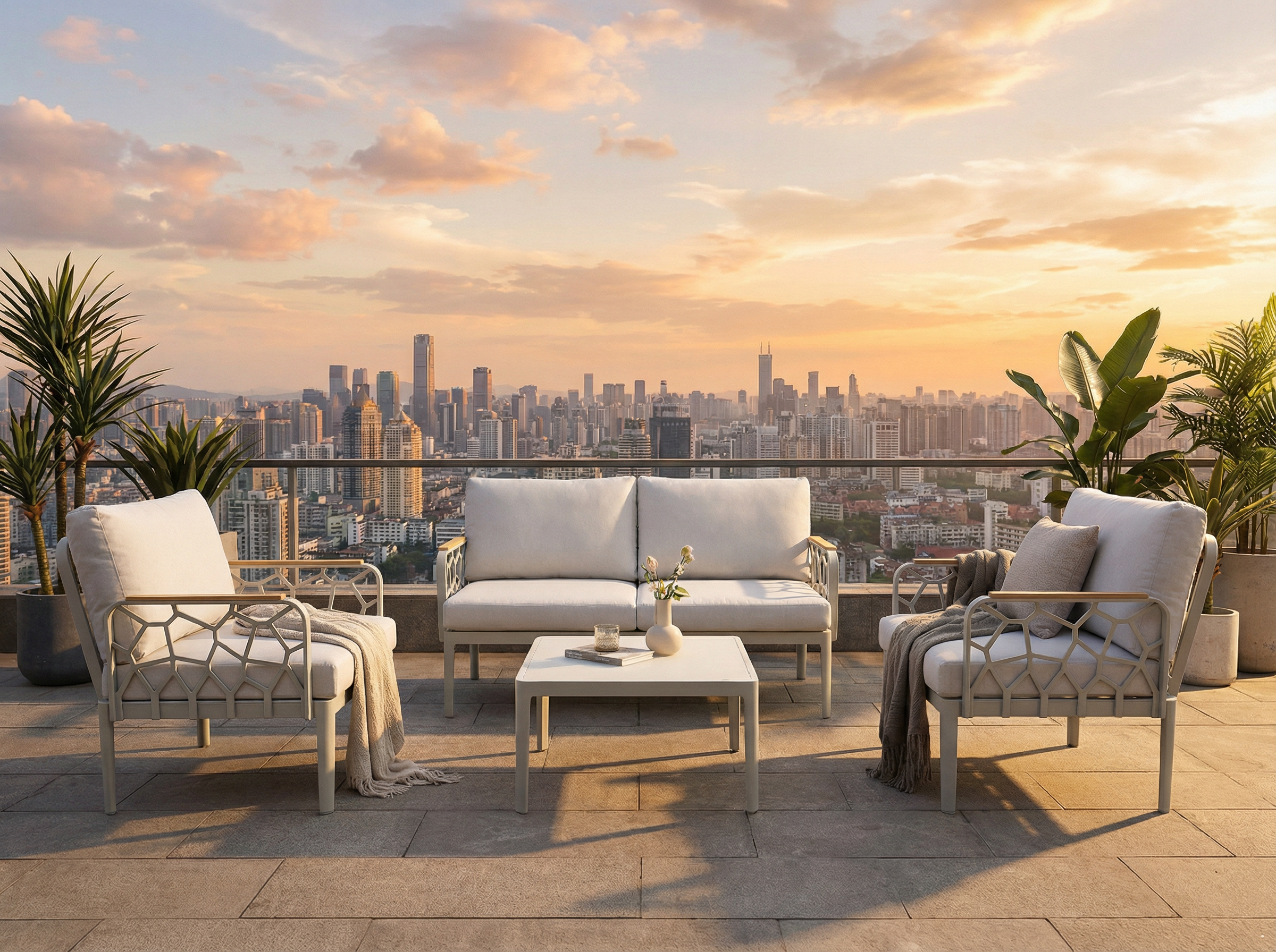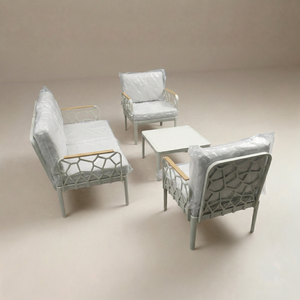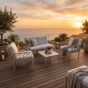 Su estructura combina la ligereza y durabilidad del aluminio con un acabado en PVC de alta calidad, garantizando que el mobiliario mantenga su integridad frente a la exposición solar y la humedad. Los cojines están tapizados con tela antifluido, lo que facilita el mantenimiento y protege el interior de derrames accidentales o lluvias ligeras.