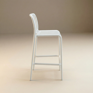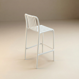 Su diseño de rejas en respaldo y asiento aporta una estética contemporánea y permite una óptima ventilación, brindando mayor confort en climas cálidos. El color blanco realza su apariencia limpia y versátil, facilitando su integración en terrazas, barras exteriores, áreas de piscina y espacios comerciales como bares y restaurantes.
