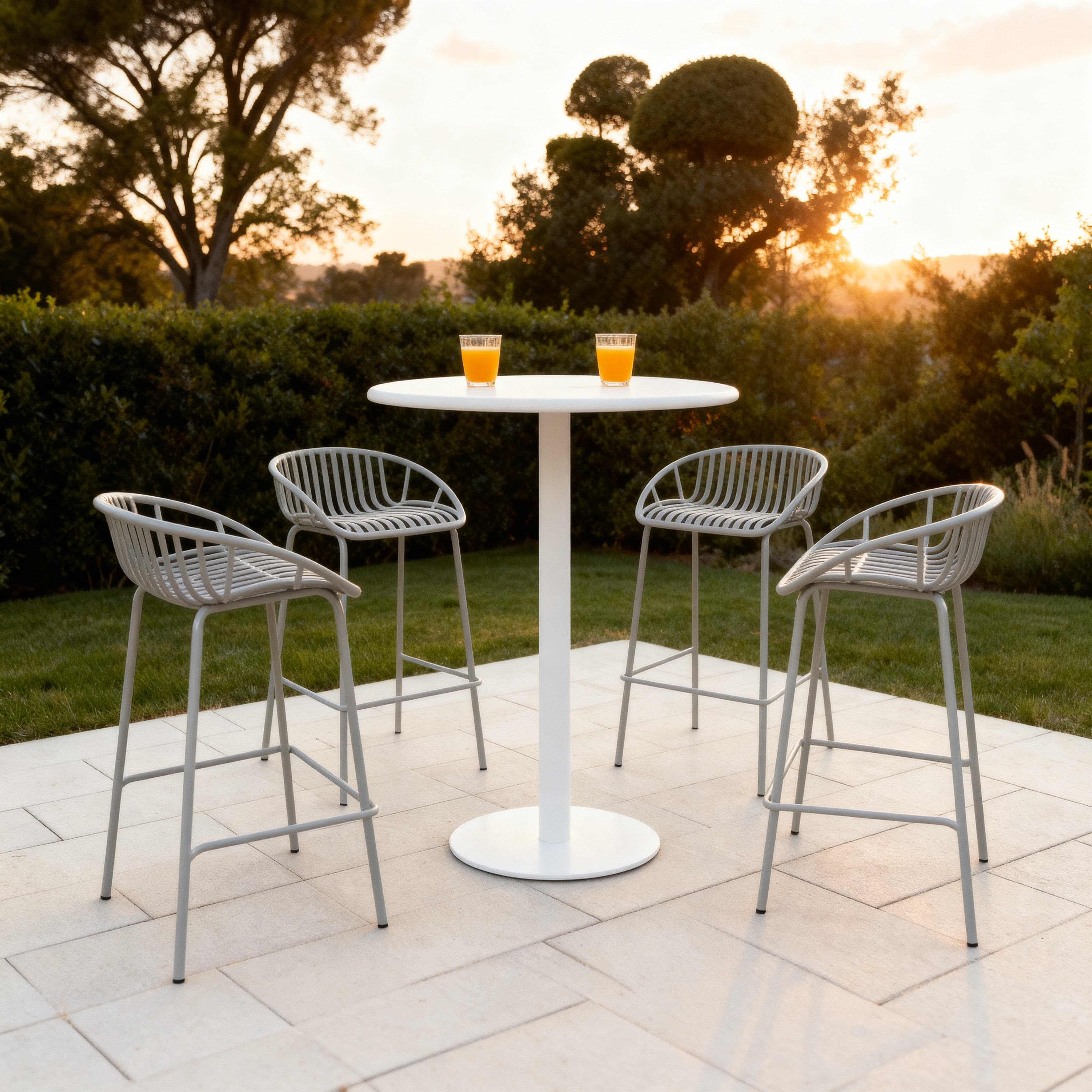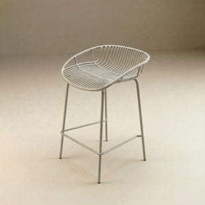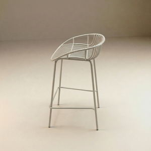 Su diseño de rejas en respaldo y asiento aporta una estética contemporánea y permite una óptima ventilación, brindando mayor confort en climas cálidos. El color blanco realza su apariencia limpia y versátil, facilitando su integración en terrazas, barras exteriores, áreas de piscina y espacios comerciales como bares y restaurantes.