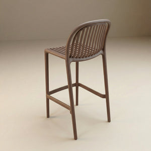 Su diseño de rejas en respaldo y asiento aporta una estética contemporánea y permite una óptima ventilación, brindando mayor confort en climas cálidos. El color marrón realza su apariencia limpia y versátil, facilitando su integración en terrazas, barras exteriores, áreas de piscina y espacios comerciales como bares y restaurantes.