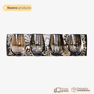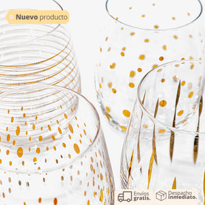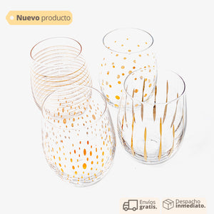 Set de vasos x4 en cristal con diseño en cada vaso en dorado. Vaso para vino, vaso para fiestas. Vaso en cristal set x 4. Vaso con diseño para reuniones, fiestas. Vasos con decoración.